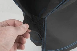 Hervorzuheben sind die optisch ansprechenden, blauen Ziernähte, die beiden stabilen Gummigriffe, die ein leichtes Abziehen der Haube ermöglichen, und die seitlichen Klettverschlüsse zum einfachen Fixieren der Haube.