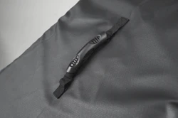Hervorzuheben sind die optisch ansprechenden, blauen Ziernähte, die beiden stabilen Gummigriffe, die ein leichtes Abziehen der Haube ermöglichen, und die seitlichen Klettverschlüsse zum einfachen Fixieren der Haube.