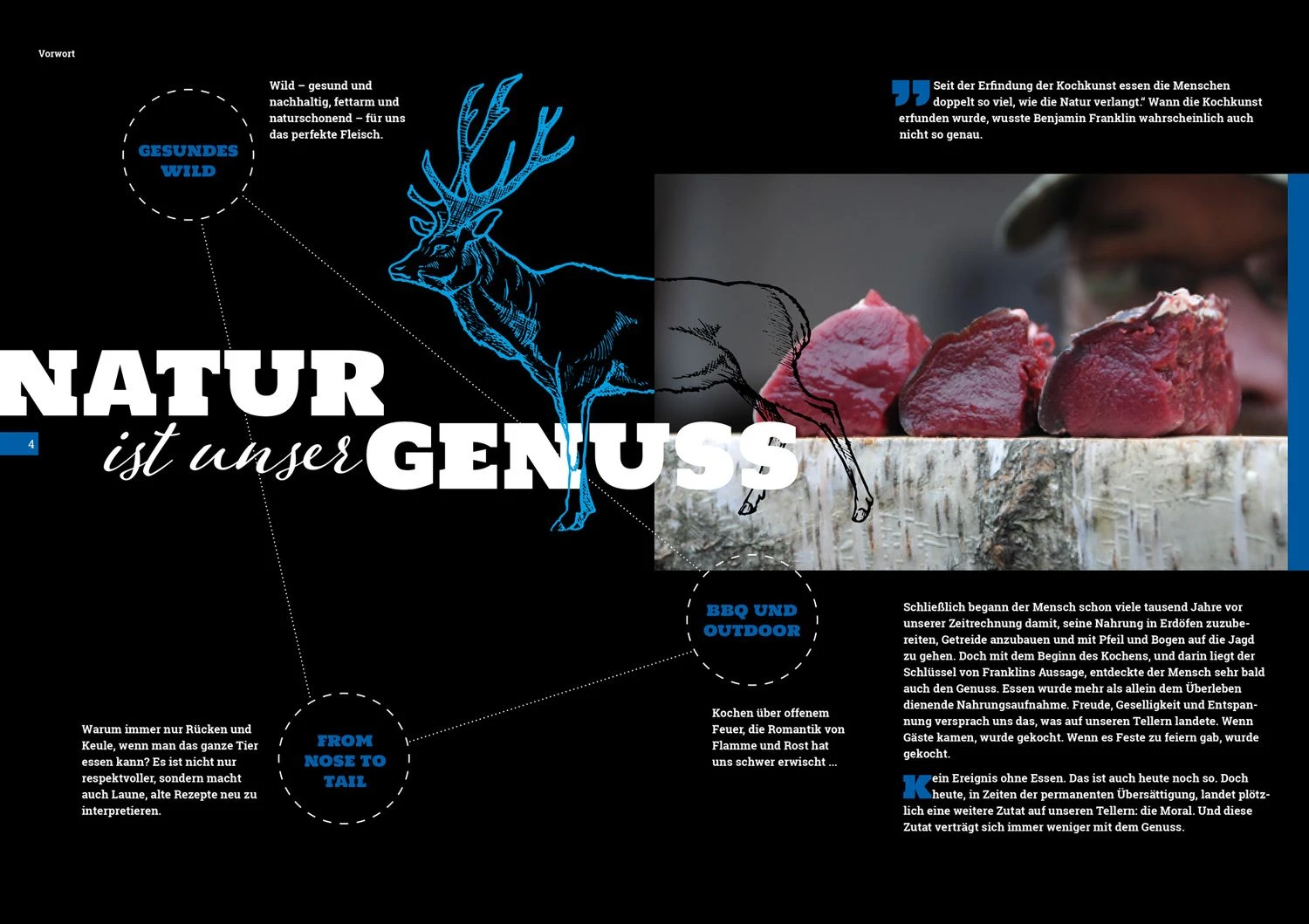Unter dem Motto „from nose to tail“ werden alte Rezepte neu interpretiert und Grillklassiker auf andere Tierarten übertragen. Wie wäre es also mit einem T-Bone-Steak vom Hirsch, Fleischkäse aus Wildbret oder der guten alten Ochsenschwanzsuppe aus dem Dutch Oven?