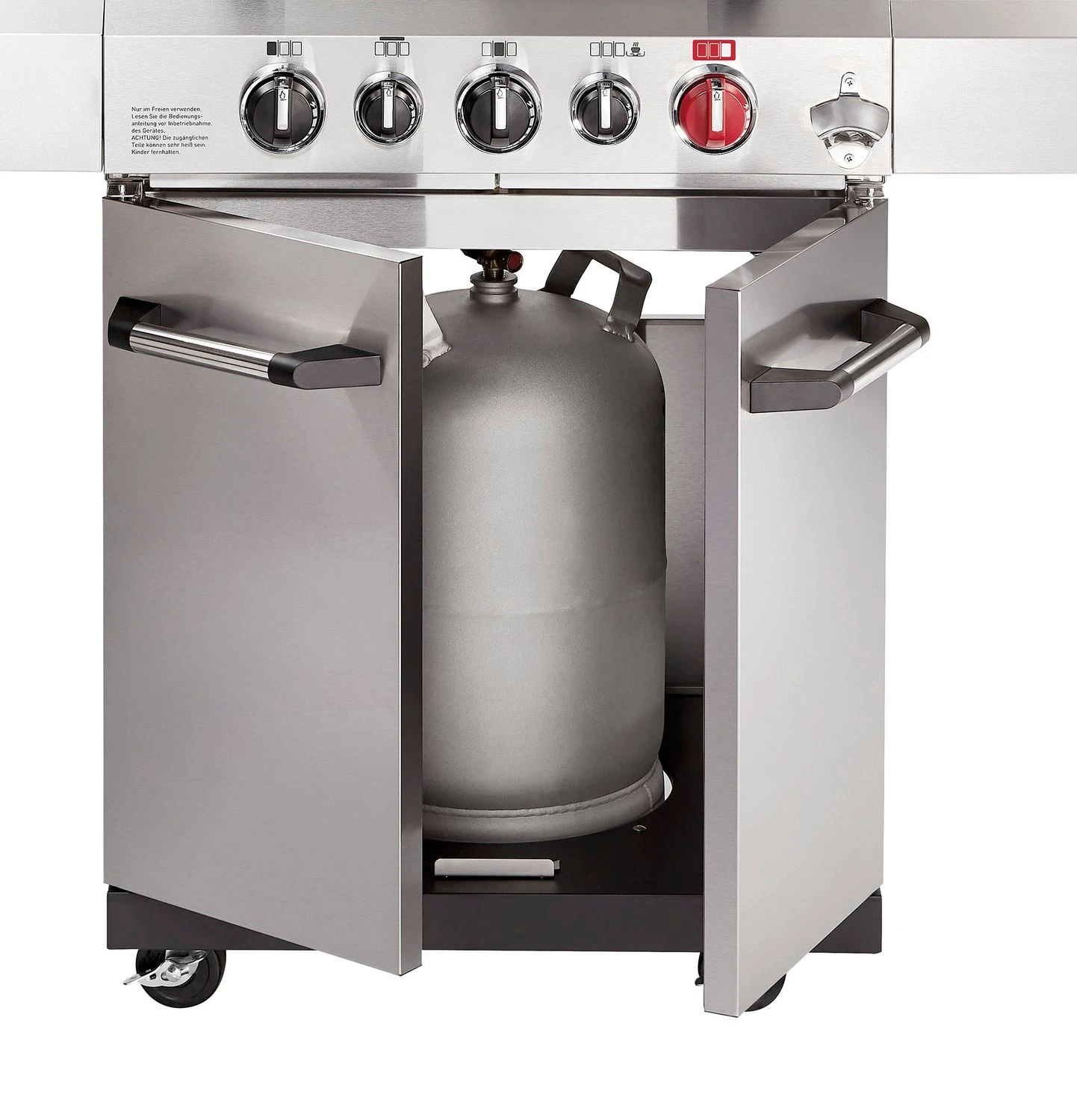 Der Enders Kansas II Pro bietet einen geräumigen Unterschrank mit genügend Platz für eine 11 kg Gasflasche. Die doppelwandigen Türen aus Edelstahl sorgen für eine hochwertige Haptik und verhindern das unschöne Klappern beim Öffnen und Schließen der Türen.