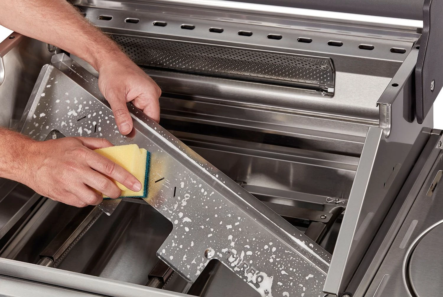 Die normalerweise ersten Verschleißteile, die Flammenschutzbleche, sind ebenso aus Edelstahl gefertigt und können sogar in der Spülmaschine gereinigt werden. Gleiches gilt übrigens auch für die Fettauffangwanne. Diese ist unterteilt in 2 kleinere Fettwannen,