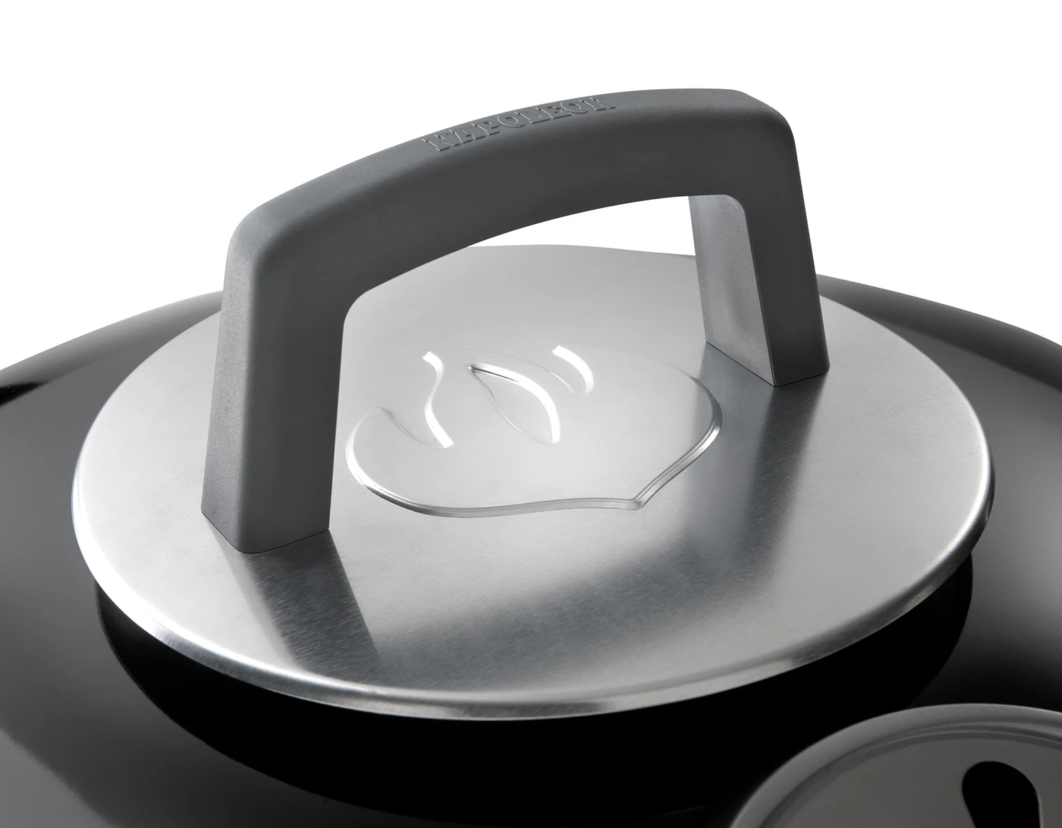 Der Deckel beherbergt eine ganze Reihe von gut durchdachten Funktionen. Zum einfachen Ablesen der Garraumtemperatur befindet sich im Deckel – gleich neben dem Abluftschieber – ein einfach abzulesendes Thermometer. Auf der Oberseite des Deckels ist ein stabiler Griff mit eingebautem Hitzeschutz montiert. Wenn Sie auf der Grillfläche mit beiden Händen arbeiten müssen, kann der Deckel platzsparend an die Seite der Kugel gehängt werden.