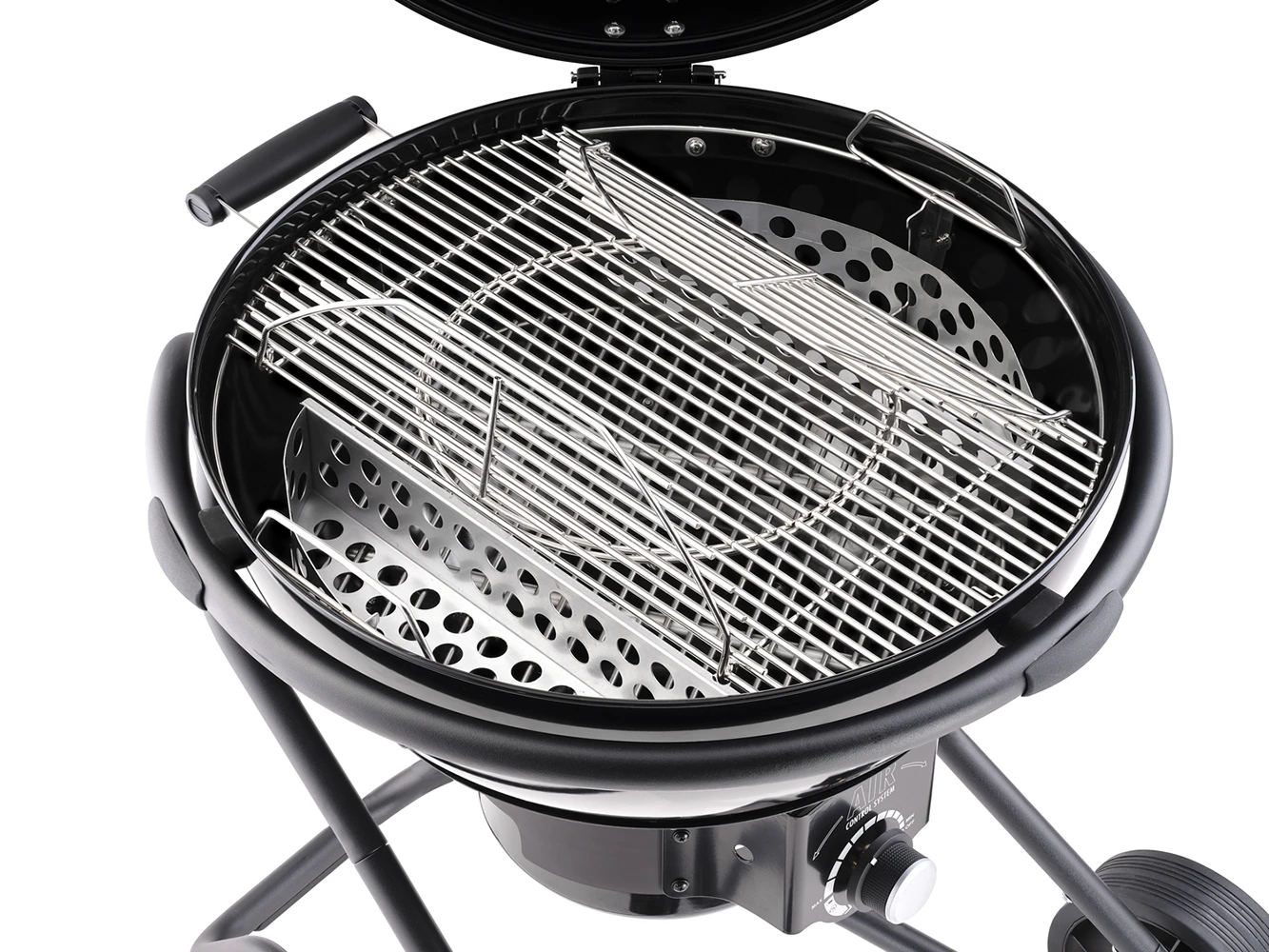 Die NERO Sonderedition ist mit dem VARIO+ Grillrost System ausgestattet. Mit dem stabilen VARIO Grillrost aus Edelstahl sind auf ihrem Grill noch mehr Gerichte möglich. Dafür sorgen verschiedene Einsätze aus dem Rösle Zubehör Sortiment, die einfach in die Aussparung in der Mitte eingesetzt werden. Vorteil dabei: Die Platzierung direkt über der Glut sorgt für ordentlich Hitze und damit für erstklassige Ergebnisse.