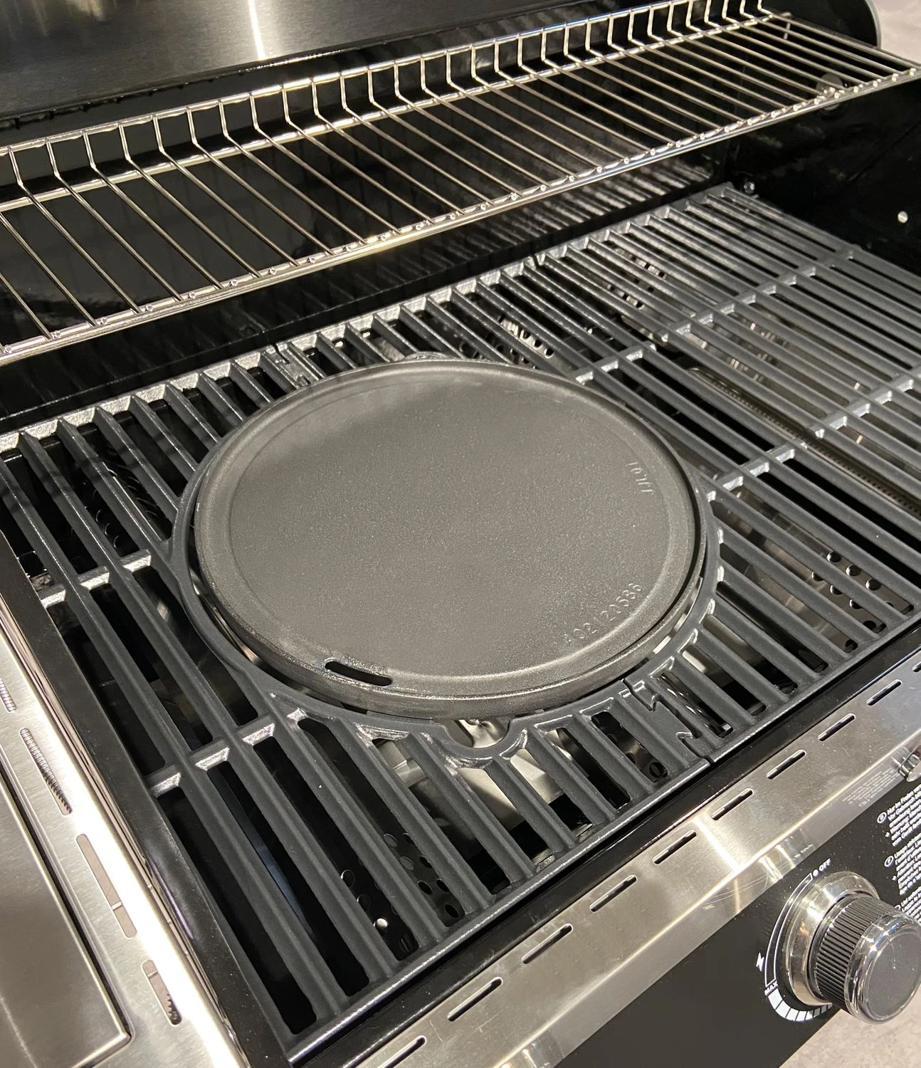 Die gusseiseren, runde Grillplatte von Rösle verfügt über eine glatte und eine geriffelte Seite und ist beidseitig verwendbar: