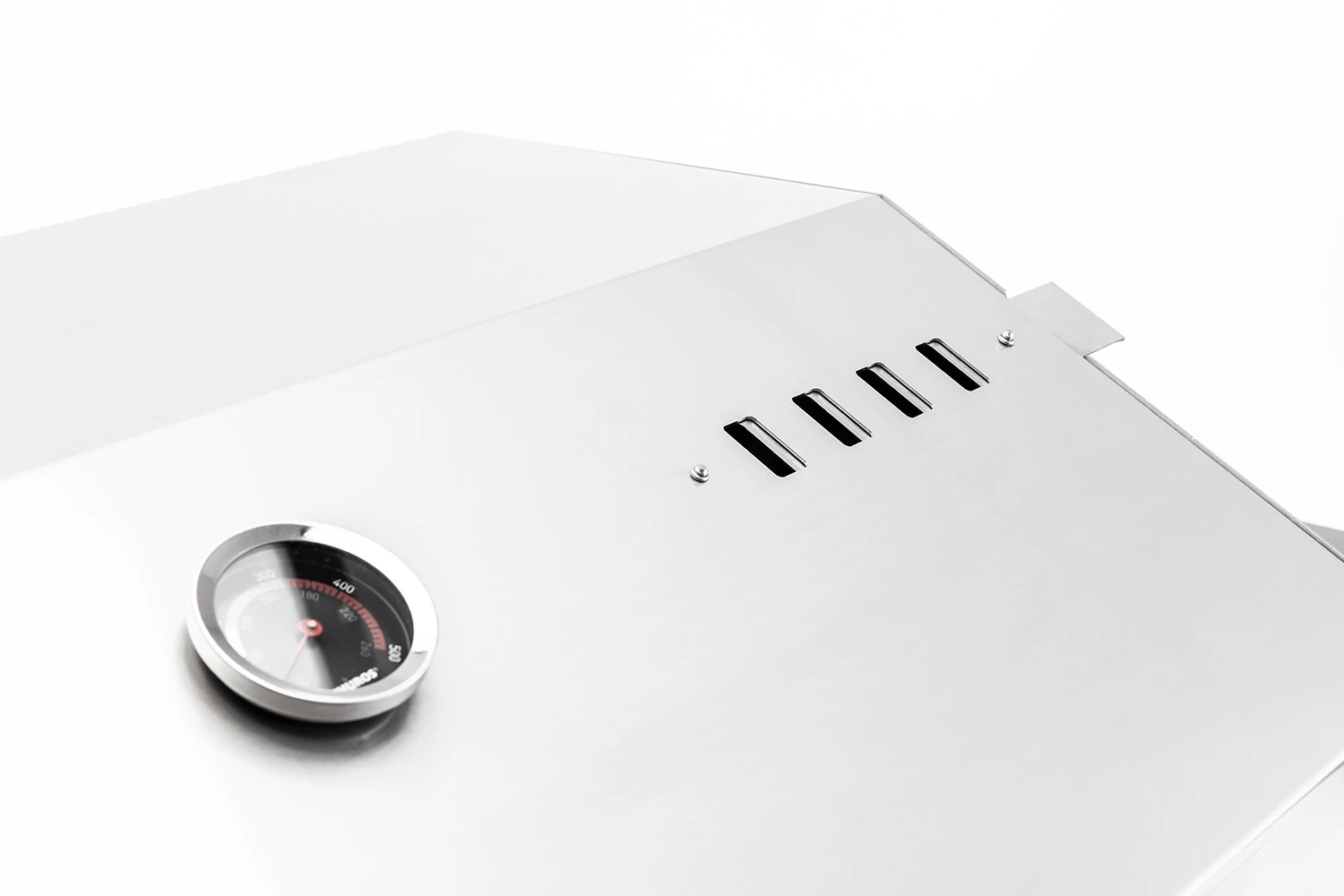 - Schwenkhaube mit 260°C Thermometer und Schieber zur Luftregulierung – ermöglicht auch indirektes Grillen und Räuchern